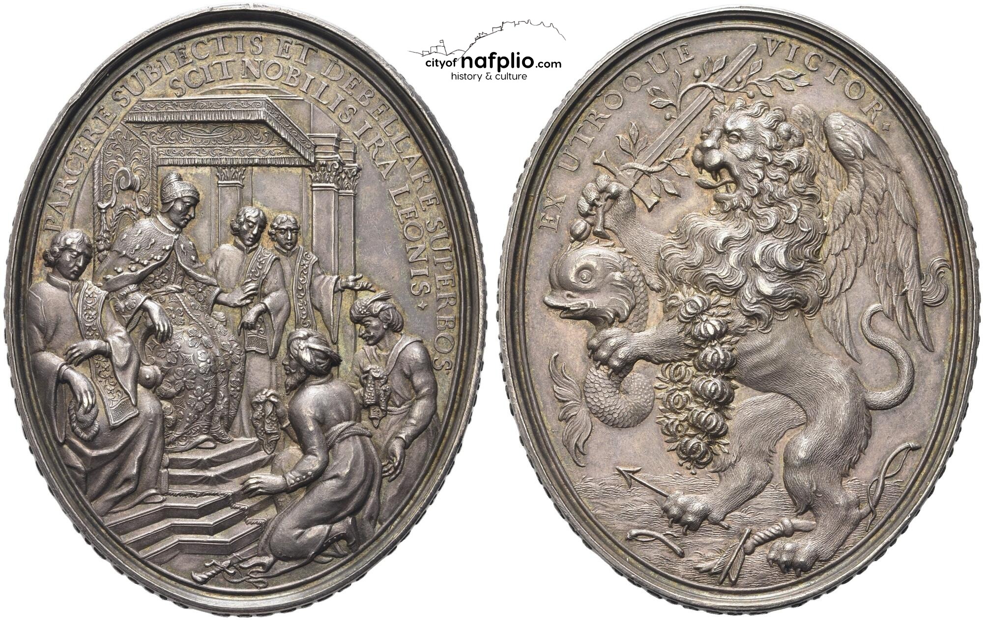 Στην πίσω όψη του μεταλλίου του 1687, του Hans Jacob Wolrab, δείχνει τη Βενετία με τη μορφή μιας γυναίκας που κρατά έναν Τούρκο αιχμάλωτο και έναν λύκο αλυσοδεμένο πάνω της, ακόμη πιο ενδιαφέρον είναι το εξαιρετικό μετάλλιο, ένα έργο πάλι από τον Georg Hautsch, που επινοήθηκε στη Νυρεμβέργη σε διάφορα πολύτιμα μέταλλα το 1687 (Voltolina, ν. 1054), αντιπροσωπεύοντας τους δύο αδερφούς Mustafà Pascià και Hassan Pascià στην πράξη του φόρου τιμής στον δόγη.
